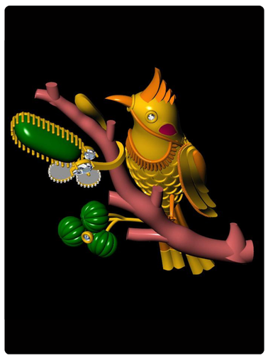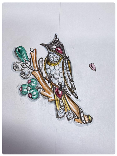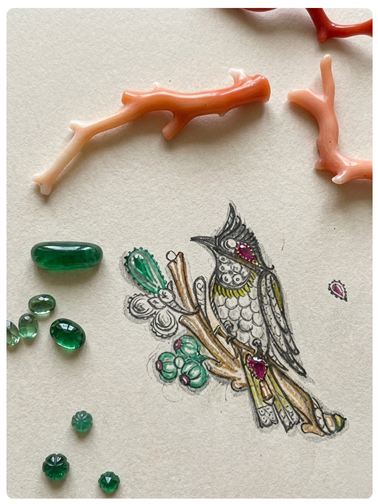 Bulbul features amalgamation of Coral, Zambian emeralds, Mozambique rubies, Polki and Diamonds.